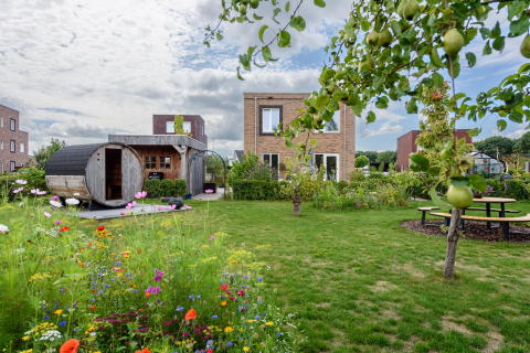 Vanuit de woonkamer komt u middels de luxe grote dubbel opengaande schuifpui in de fraai en gezellig aangelegde achtertuin, gelegen op het zuidoosten, die in 2022 is aangelegd.